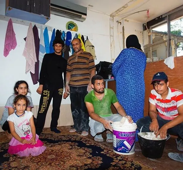 Khalaf Faraj, stands with his family of 6 in what is left of their home. It’s been a month since the blast occurred, yet they are still removing the rubble from their destroyed home. It's been a month since the blast occurred, and all seven of them are still sleeping outside.